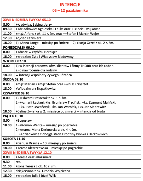 OGŁOSZENIA DUSZPASTERSKIE XXVII Niedziela zwykła 05.10.2025