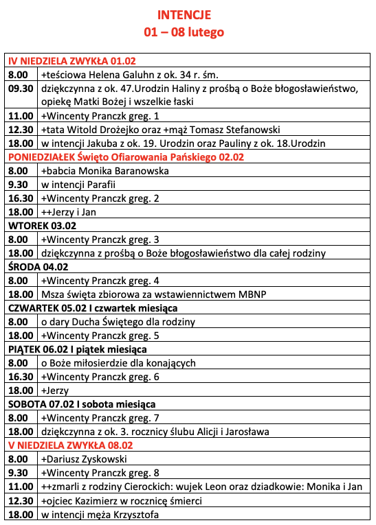 OGŁOSZENIA DUSZPASTERSKIE IV NIEDZIELA ZWYKŁA 01.02.2026