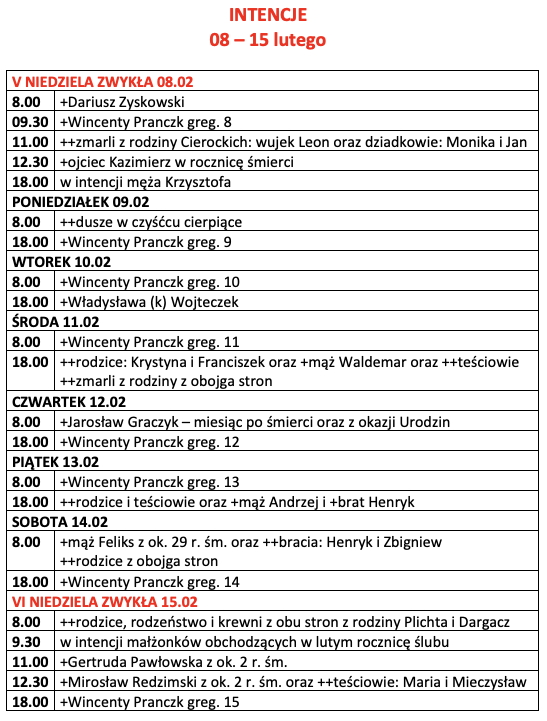 OGŁOSZENIA DUSZPASTERSKIE V NIEDZIELA ZWYKŁA 08.02.2026