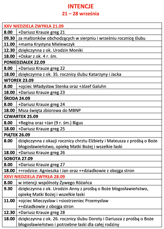 OGŁOSZENIA DUSZPASTERSKIE XXV Niedziela zwykła 21.09.2025