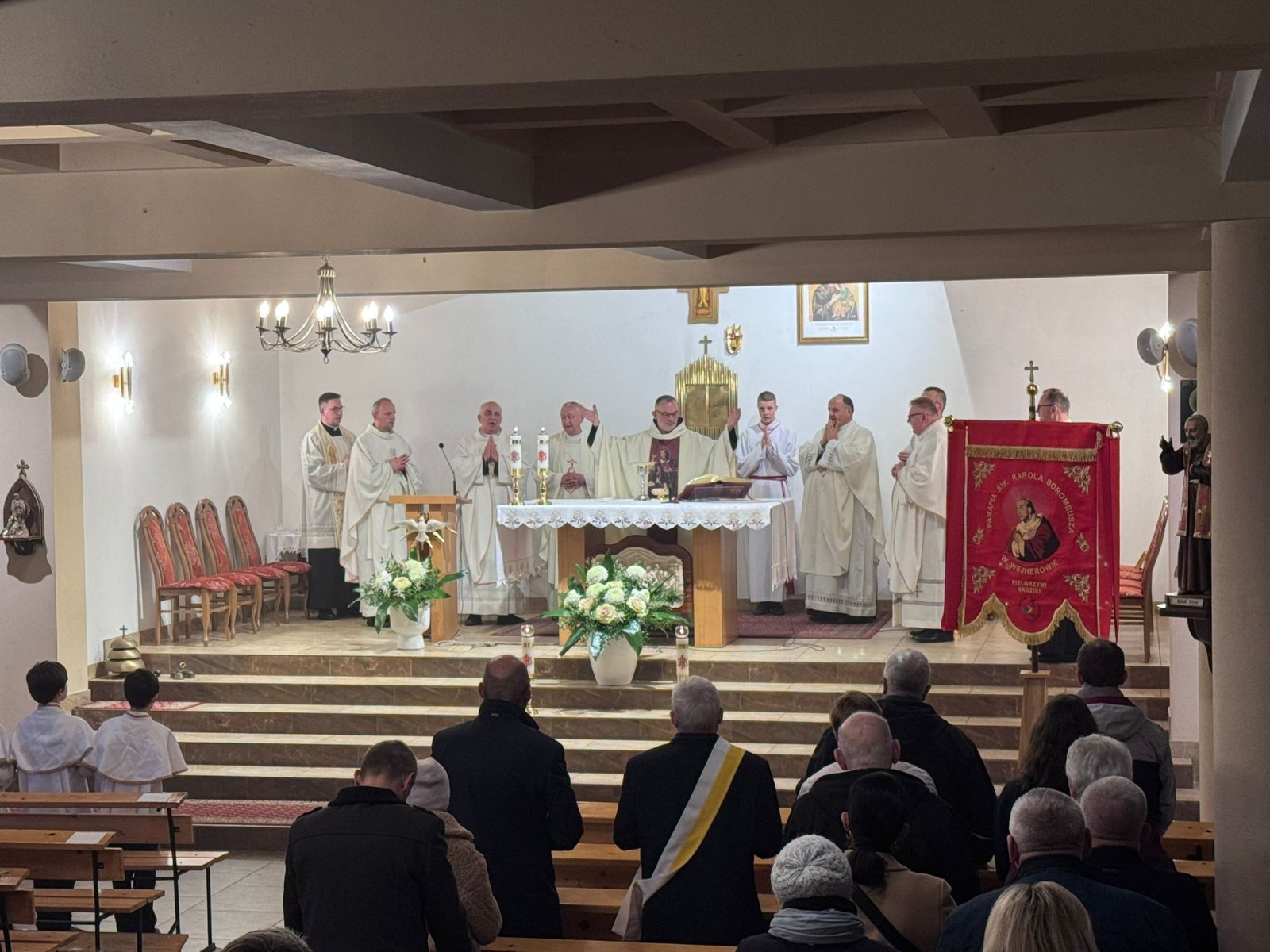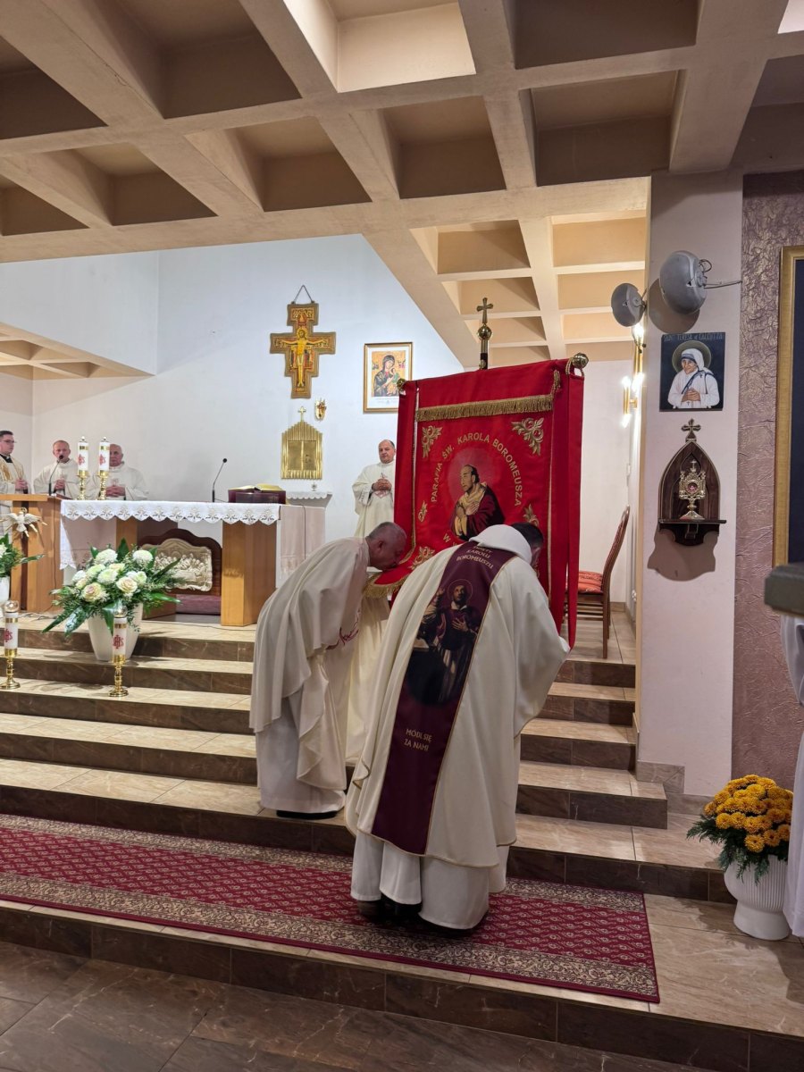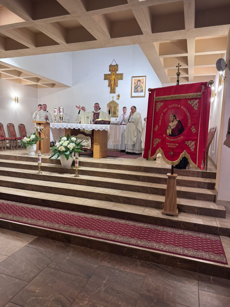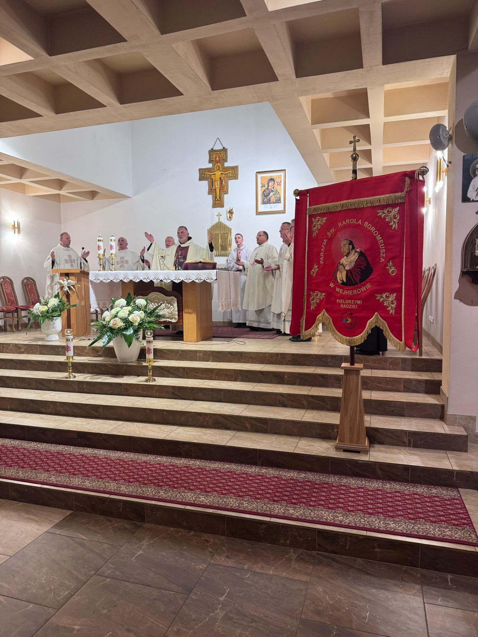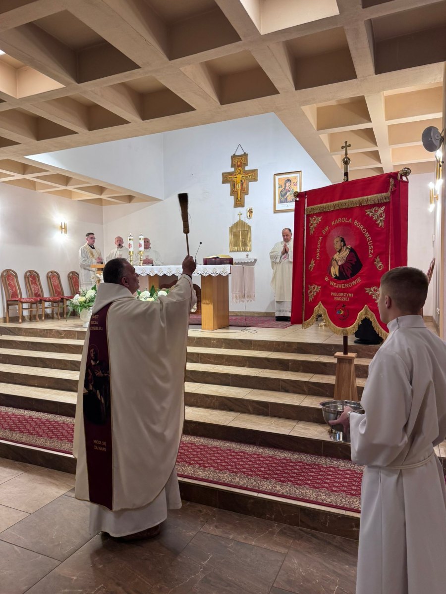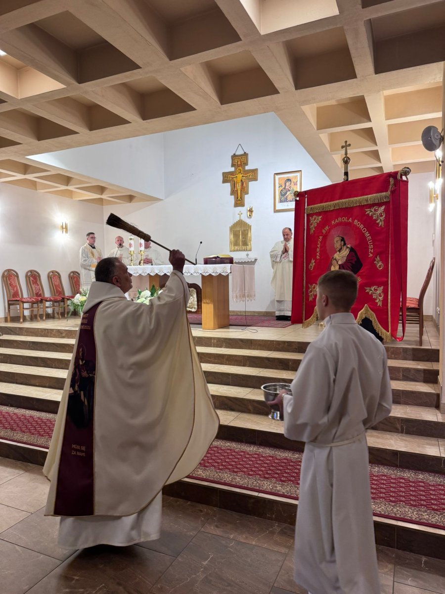 W niedzielę, 9 listopada 2025 przeżywaliśmy w naszej parafii uroczystość odpustową ku czci naszego patrona św. Karola Boromeusza. Suma odpustowa z udziałem kapłanów dekanatu oraz księży gości była sprawowana o godz. 12.30. Kazania odpustowe głosił o. Kamil Paczkowski, gwardian klasztoru franciszkanów w Wejherowie. Podczas uroczystej Sumy poświęcona została pierwsza w historii naszej parafii chorągiew procesyjna. Chorągiew z jednej strony przedstawia wizerunek naszego patrona i upamiętnia przeżywany w Kościele Rok Święty. Na drugiej stronie znajduje się logo naszej Archidiecezji, która w tym roku świętuje 100 lecie swego powstania.